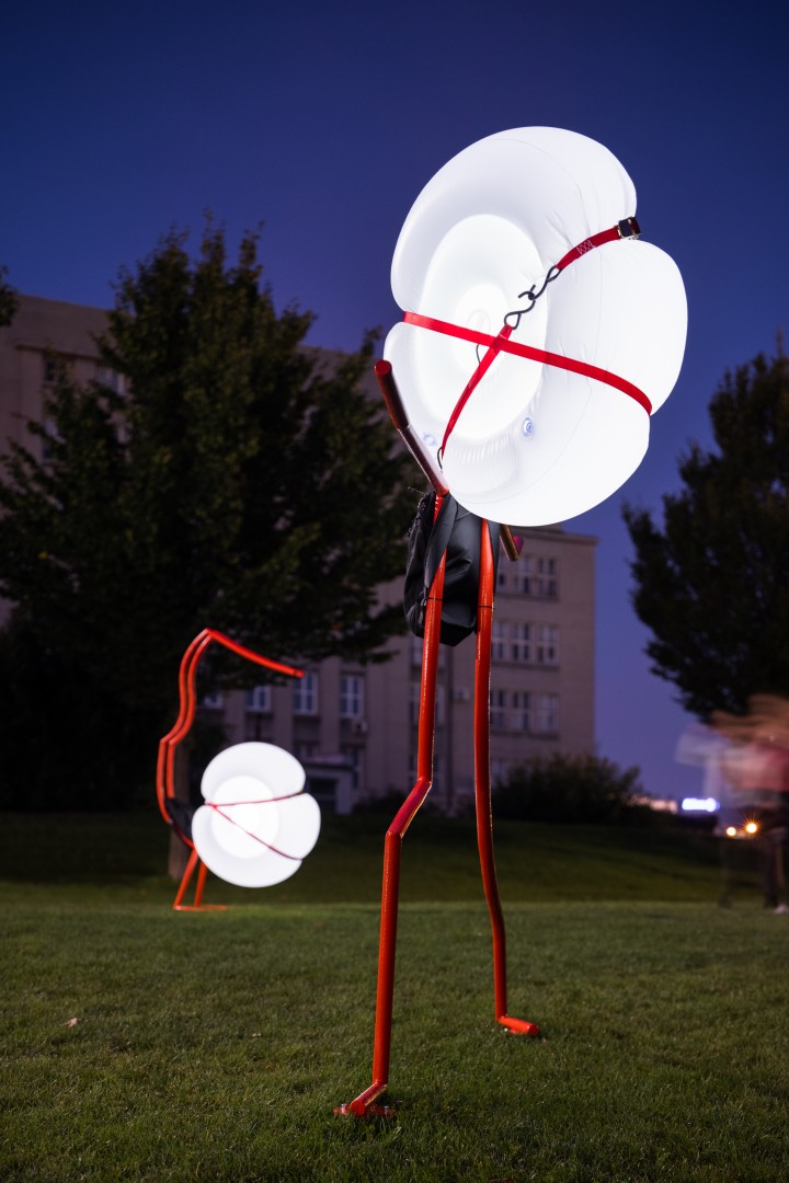 Under Pressure is a light and sound installation. It consists of 8 exercising figures with their heads squeezed in fastening straps. The artwork reflects the topic of stress and work pressure, which society tries to fix with exercising, for example with modern yoga, but ignores the systematic solutions to prevent burn-out. The series points to the contrast between a society that has embarked on the trend of a healthy lifestyle and a society that is struggling with mental health problems. Author offers ironic commentary on an individual who is looking for harmony in physical activity, while his motivation is to cope with work stress, anxiety and psychological pressure – emphasizing the need to set the overall pace of our lives in a healthier way. From a certain point on, it is no longer enough to “practice” (yoga) twice a week. The author deals with the topic of burnout and the art work can be read based on his personal experience. In the current “corona” age, however, each viewer can attach their own story of the search for mental balance to each of the figures.